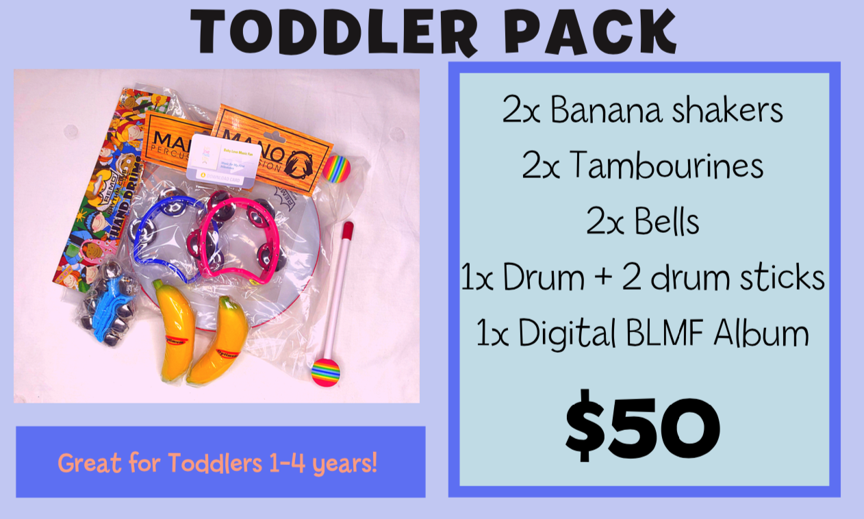 For these reasons we believe a drum is a necessity for our Toddler Pack. Two extra drum sticks are included as well, plus two tambourines, two wrist bells and two banana shakers. This is all you need to have a FUN music play session!